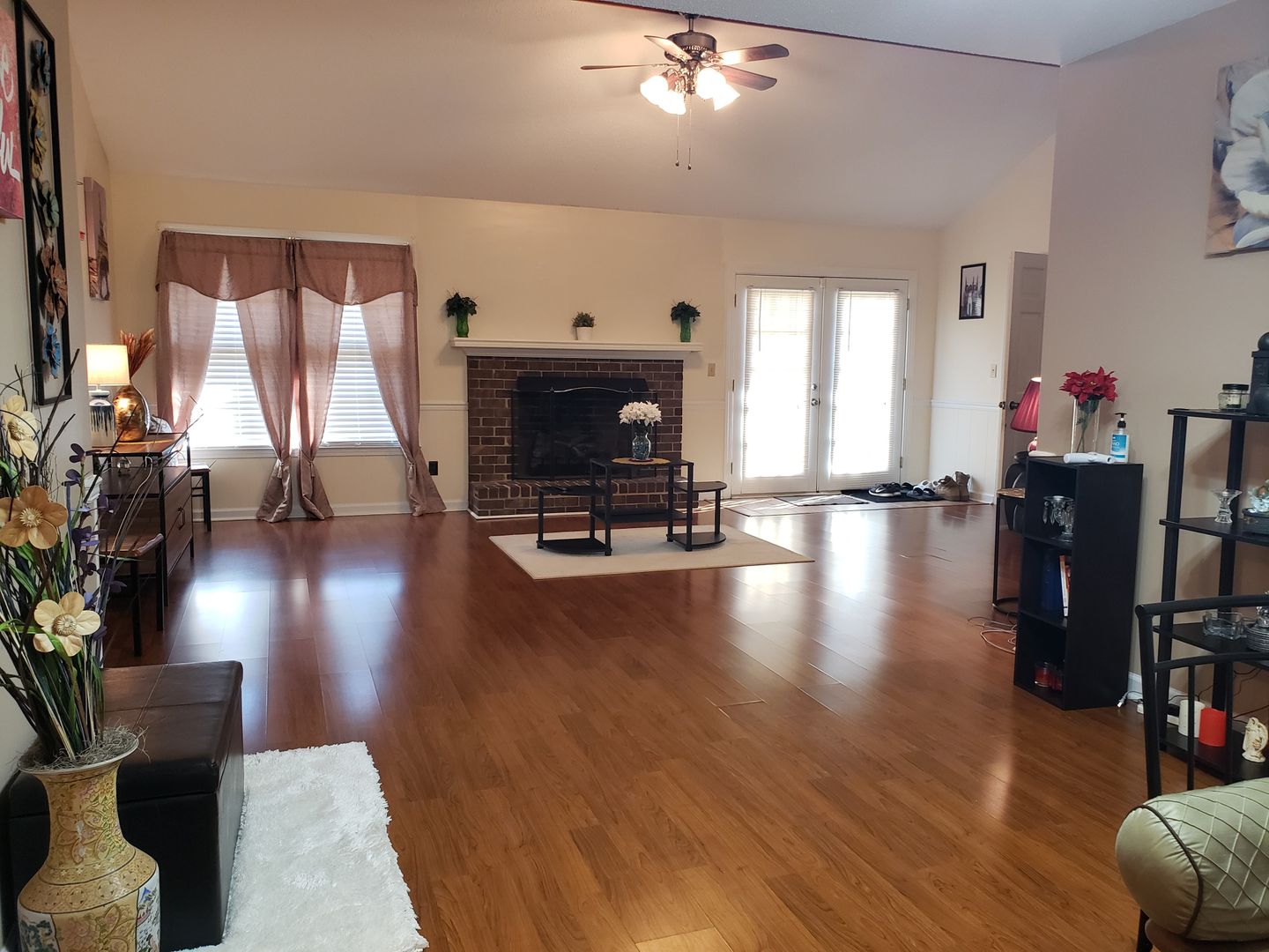 Beautifully maintained, nicely landscaped brick home with an attached two car garage, back patio, large storage building and fenced backyard. Open spaces galore! This Ranch home welcomes you into a front foyer that opens to a large dining area and entrance to hallway with a convenient coat closet. A nicely updated kitchen offers gorgeous granite counter tops, black appliances, and a large pantry. The great room features a vaulted ceiling with exposed beam, fireplace and French doors leading to the patio and fenced backyard. Just off the great room is the utility room with a half bath and entrance to the garage. The master bedroom has a private bath with granite countertop and spacious closet. The hall bath conveniently separates the sink from the shower and toilet room. Each room has a ceiling fan. Easy care laminate floors throughout main living areas. Pets allowed with owner approval and non-refundable pet fee. Home is occupied, do not disturb occupant. You can apply directly on our website at www.rentingsumter.com.